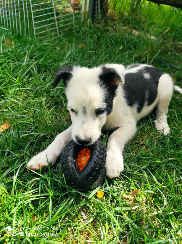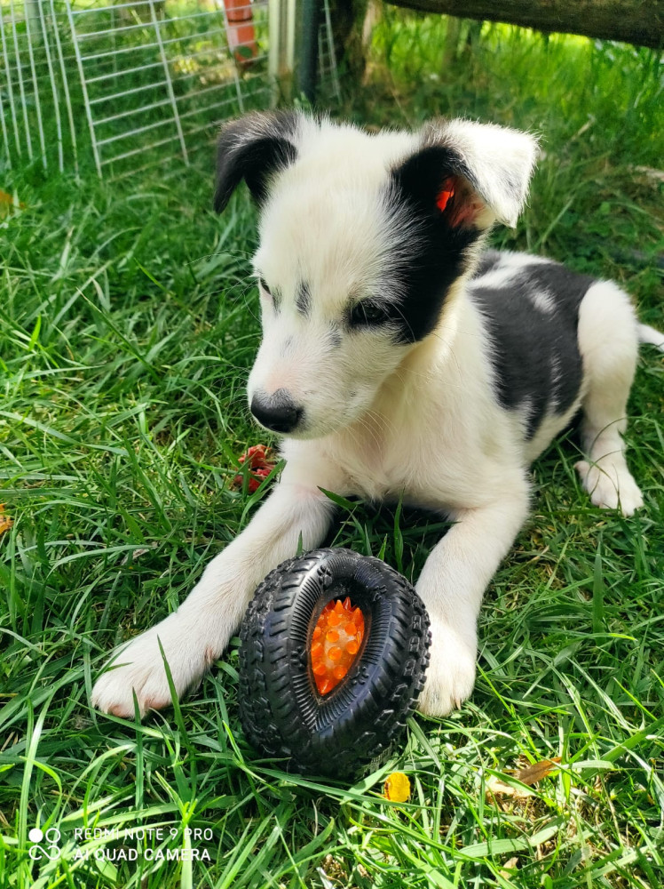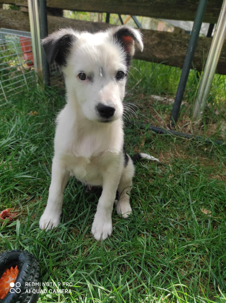 Palestino es un mestizo de border collie que fue regalado por un particular en una manifestación. La persona que lo tenía estaba entregando a los cachorros de su camada a cualquiera que pasaba por la calle, por lo que una voluntaria nuestra lo recogió, para evitar que cayera en manos de alguien que no estuviera preparado para esa responsabilidad.