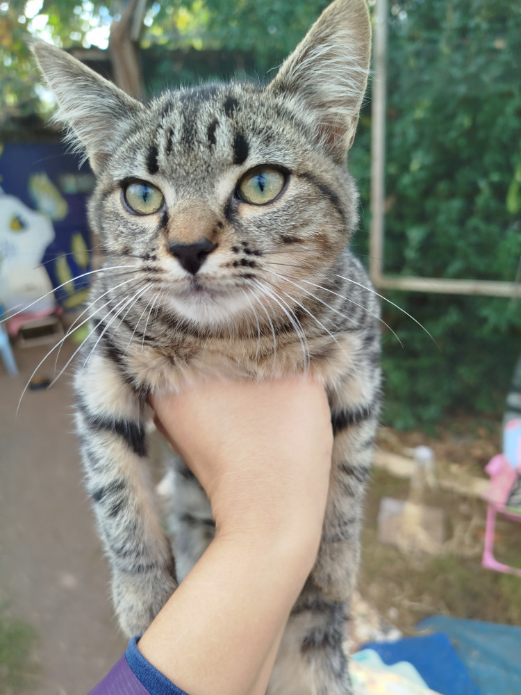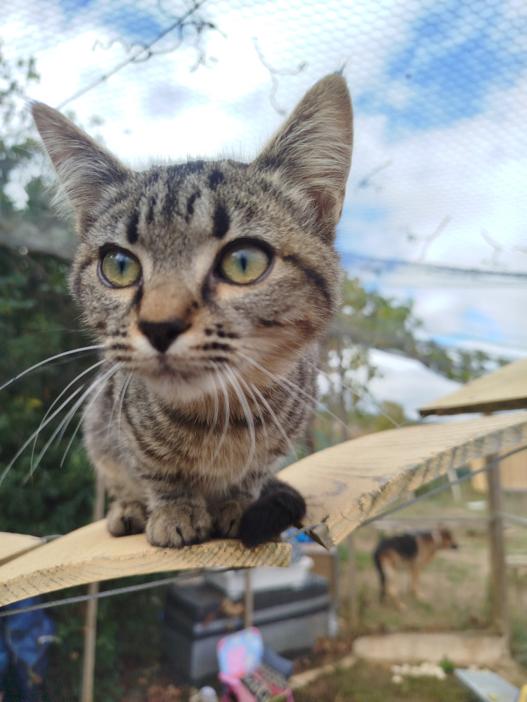 Guillen fue recogida de la autovía cuando tenía 1 mes de edad, estaba aterrorizada en el arcén. Estaba llena de parásitos y le costó mucho desarrollarse y se ha quedado pequeñita de tamaño. Pensábamos que era un chico y cuando la vacunamos vimos que era una chica. Así que queda en manos de su futura familia cambiarle de nombre 😊